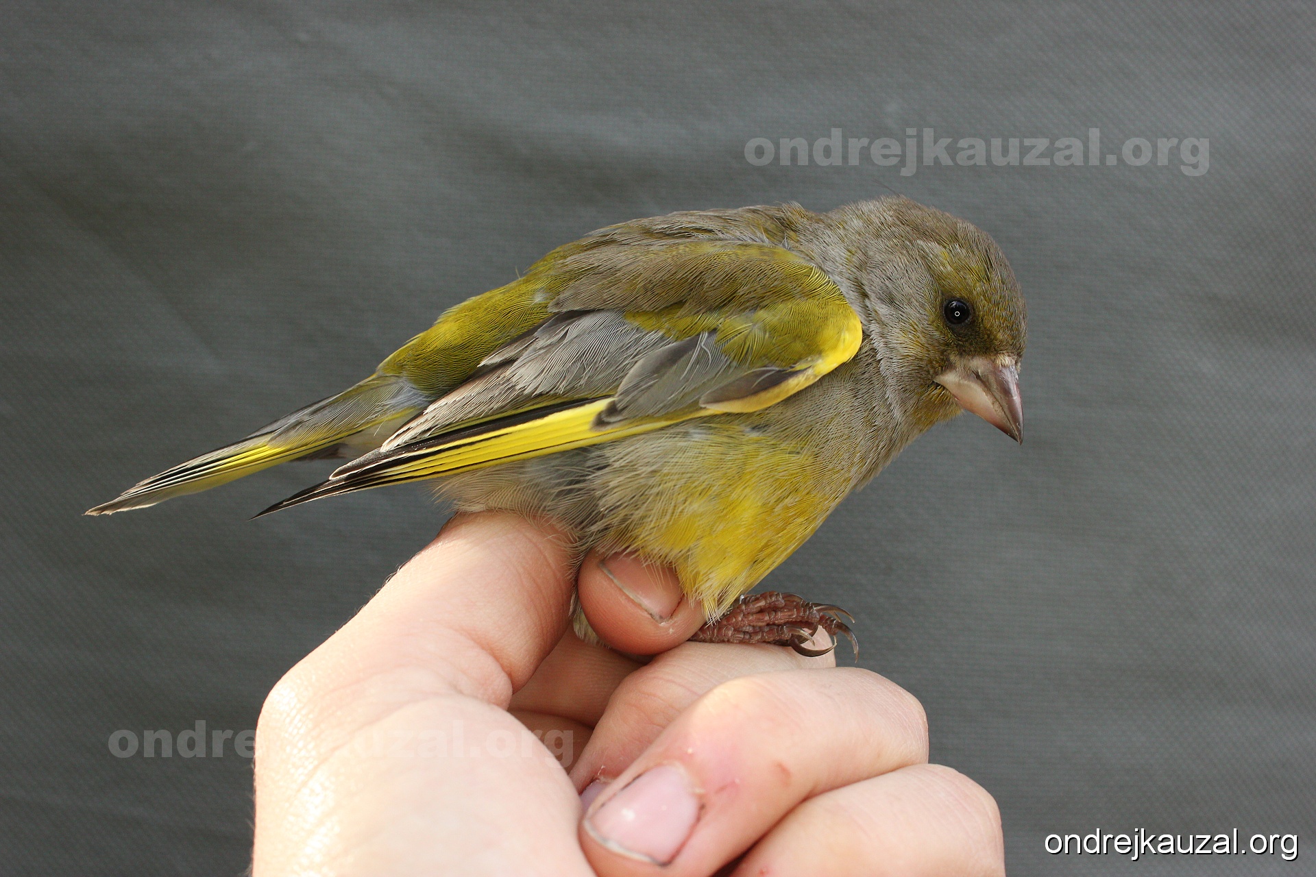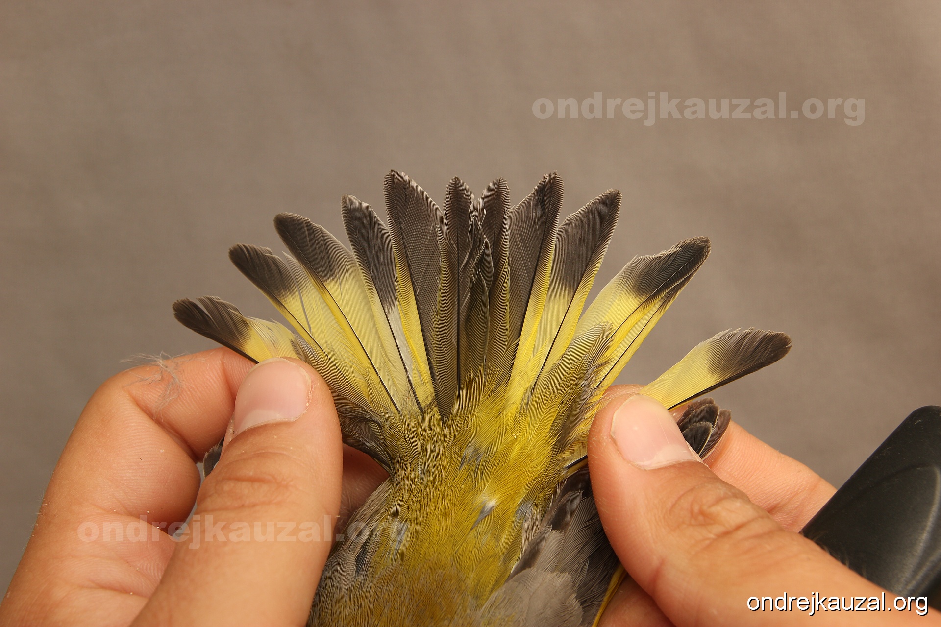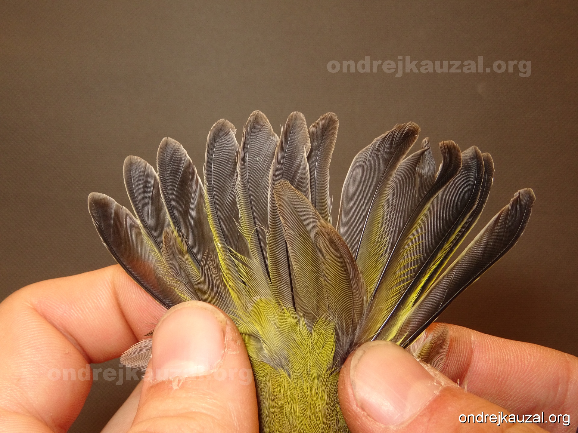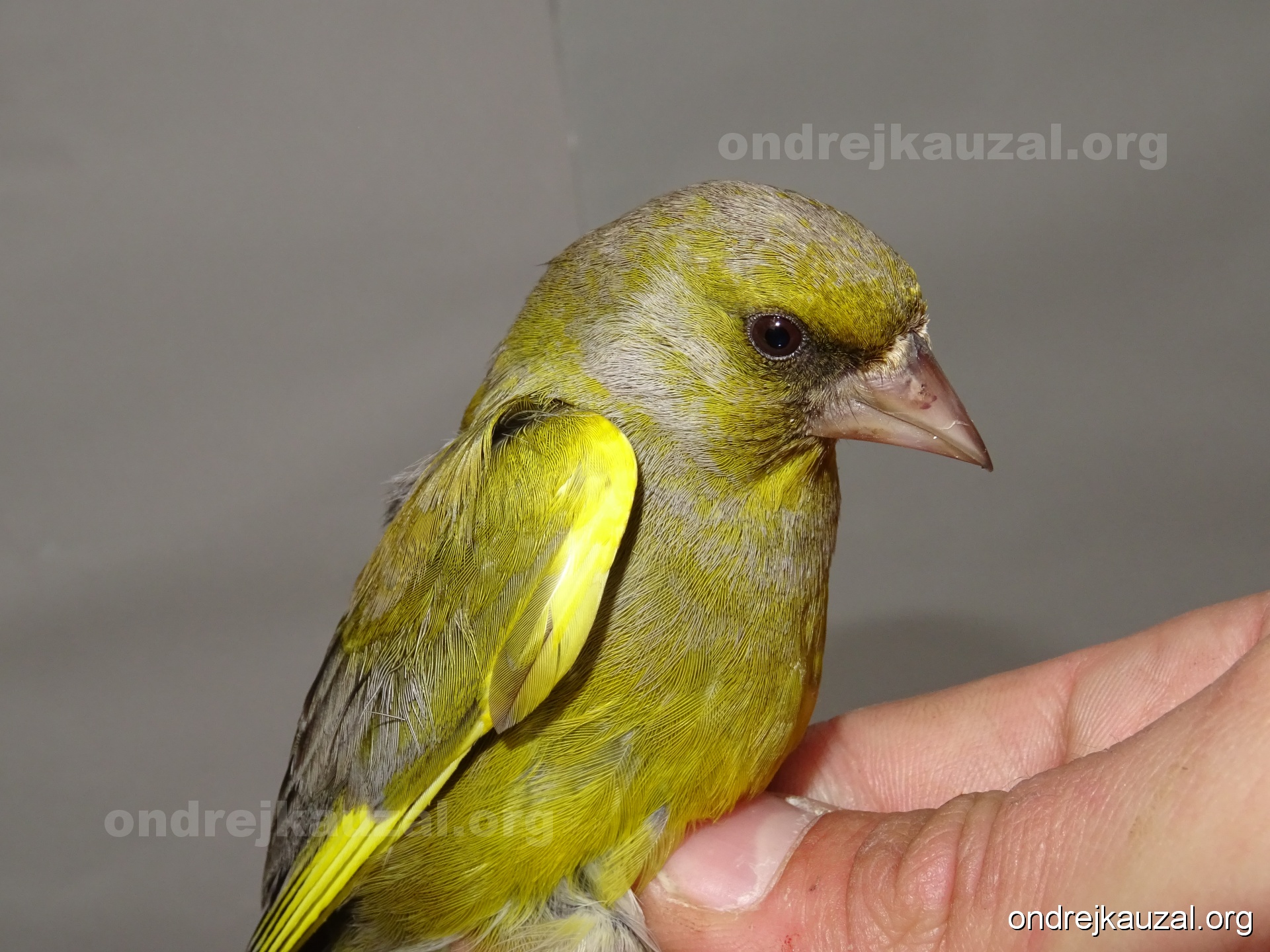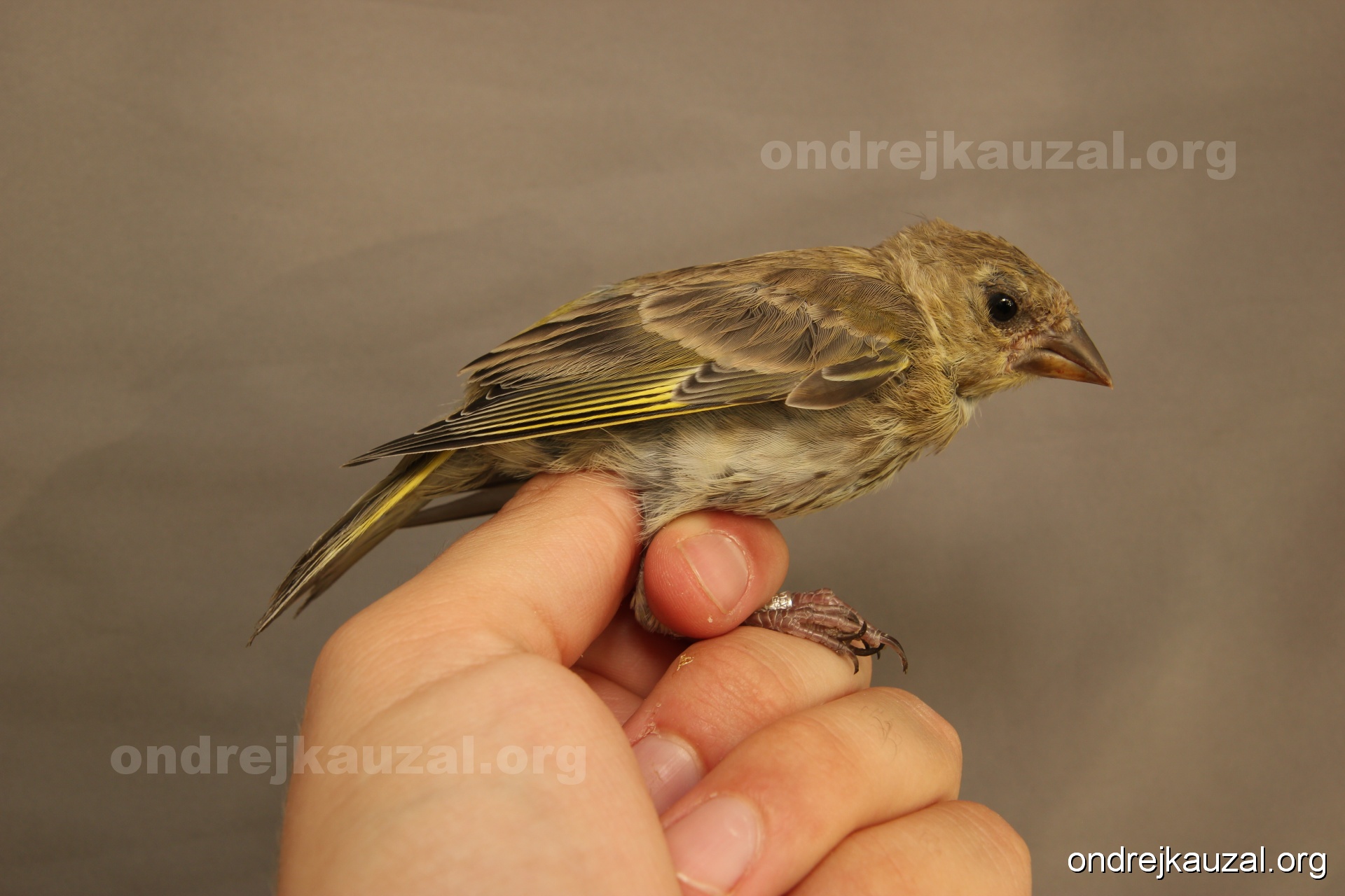 An interesting individual, albeit being in the first year of its life, it has moulted three of its primaries (P5 – P7). Greenfinches occasionally include moult of some primaries during their partial postjuvenile moult.
