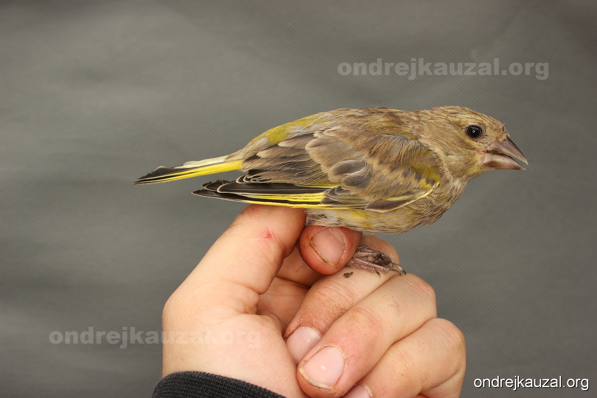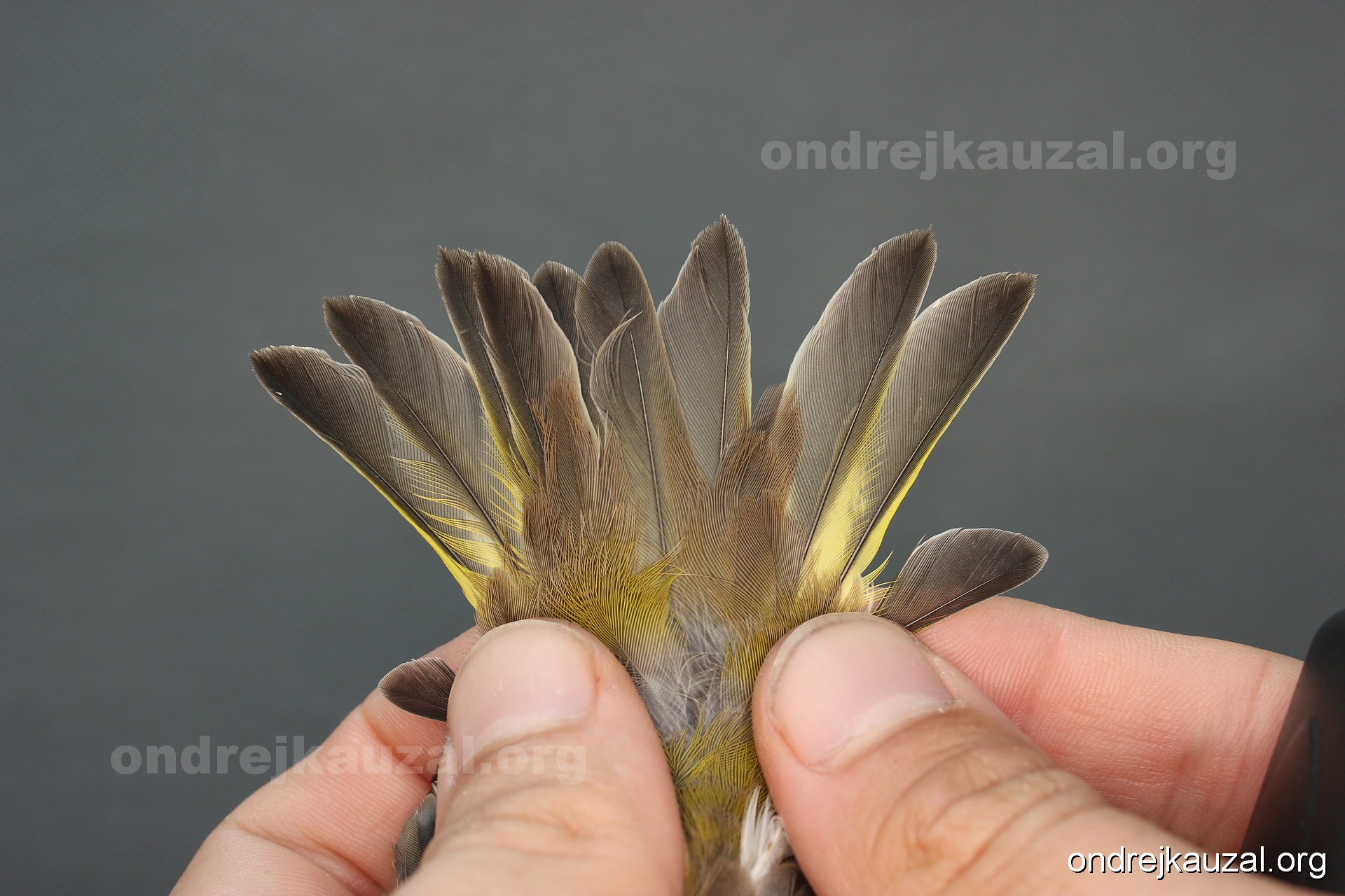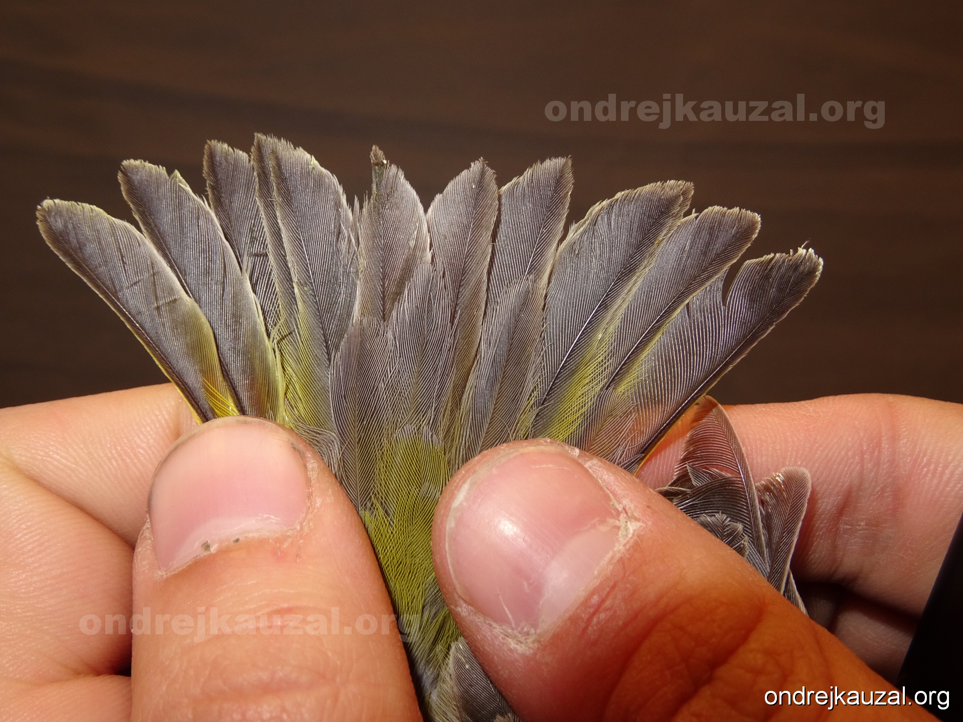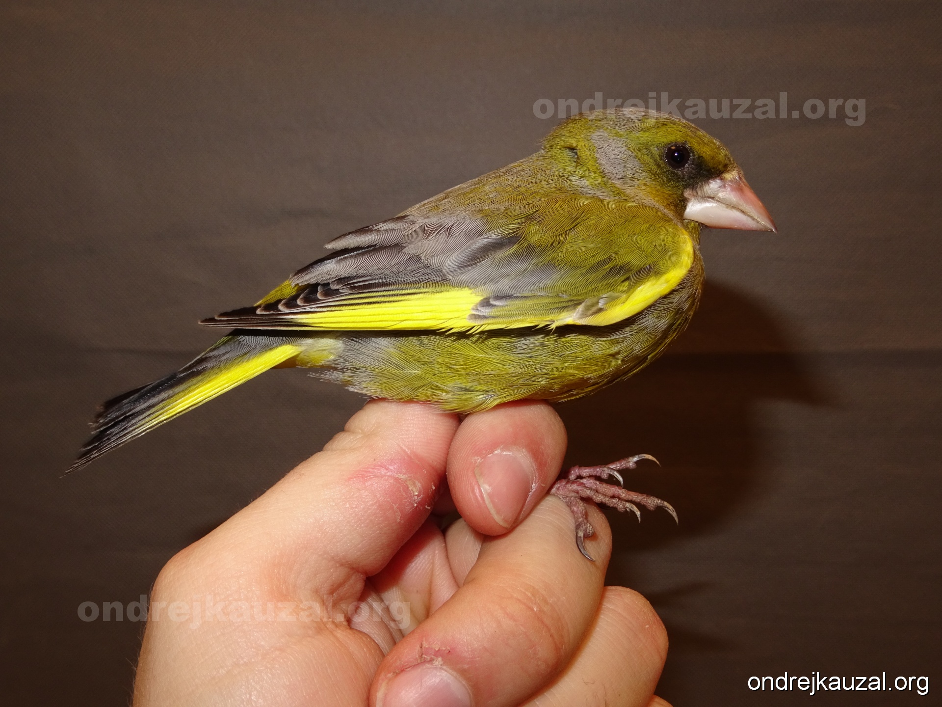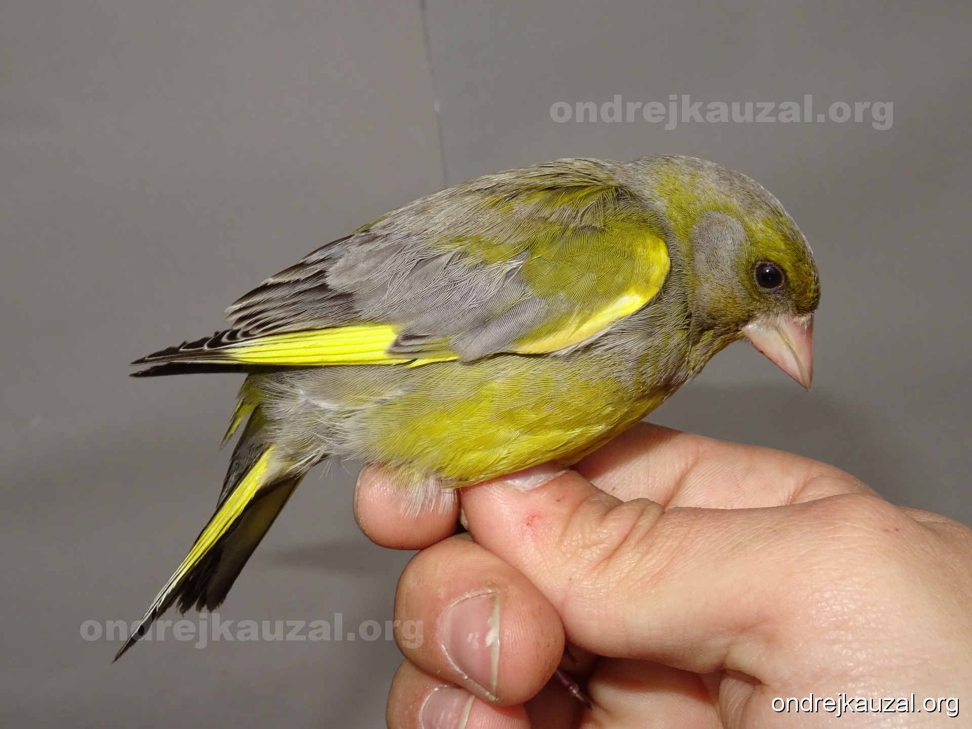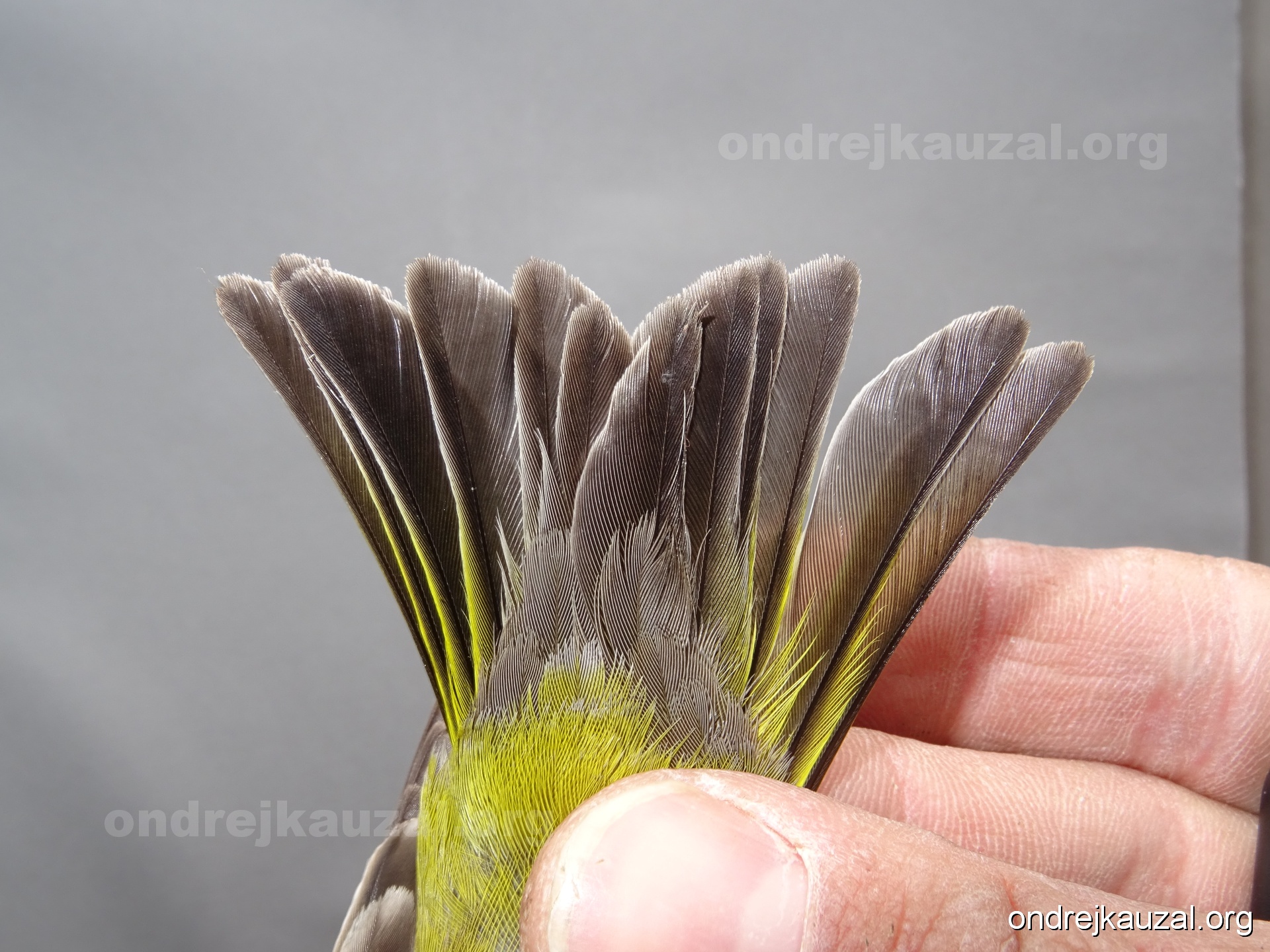 An interesting individual, albeit being in the first year of its life, it has moulted three of its primaries (P5 – P7). Greenfinches occasionally include moult of some primaries during their partial postjuvenile moult.