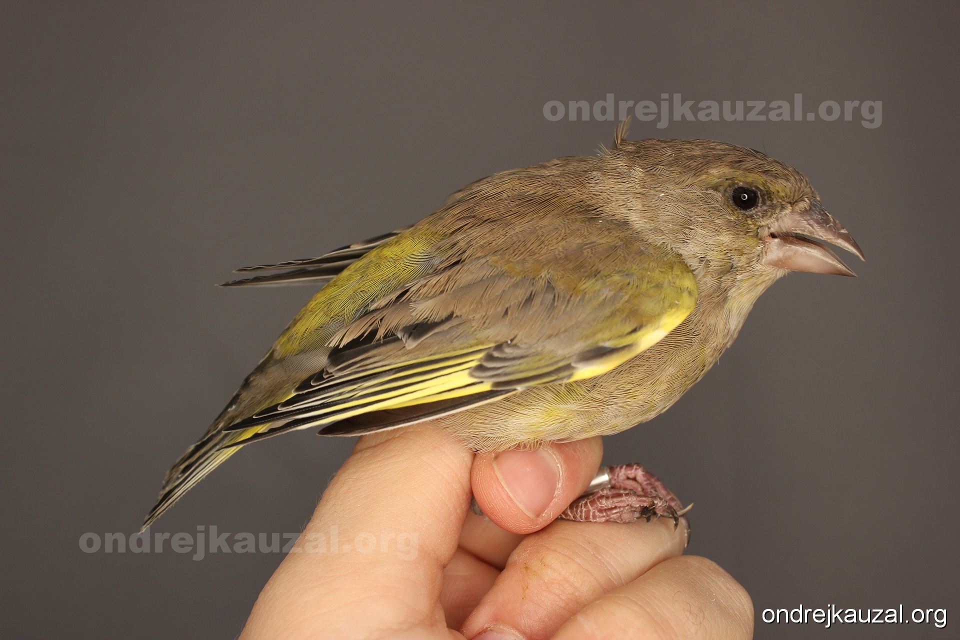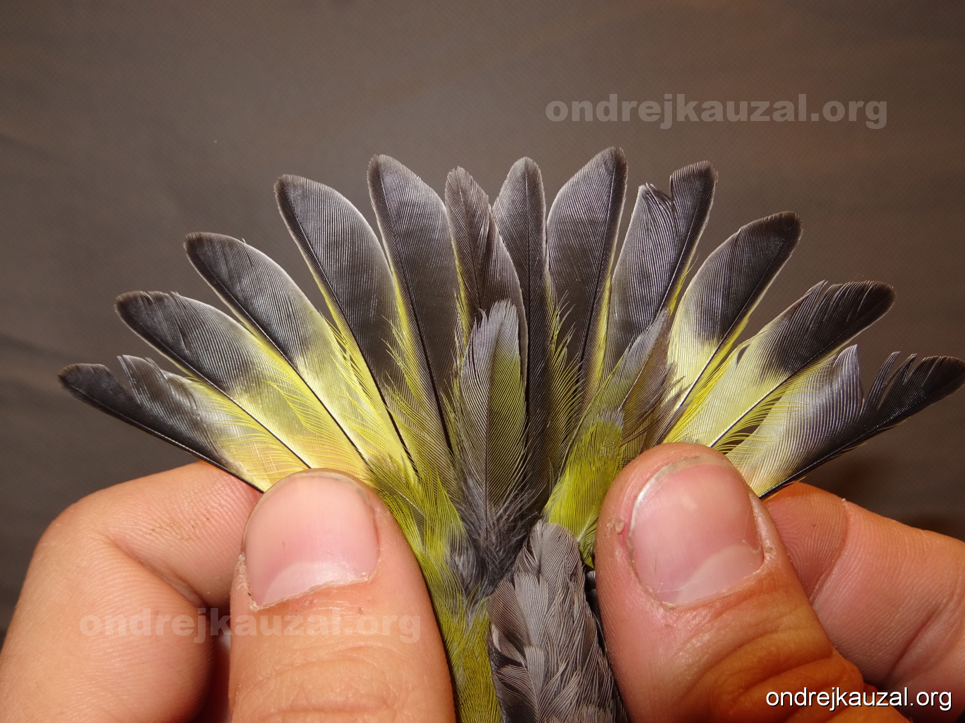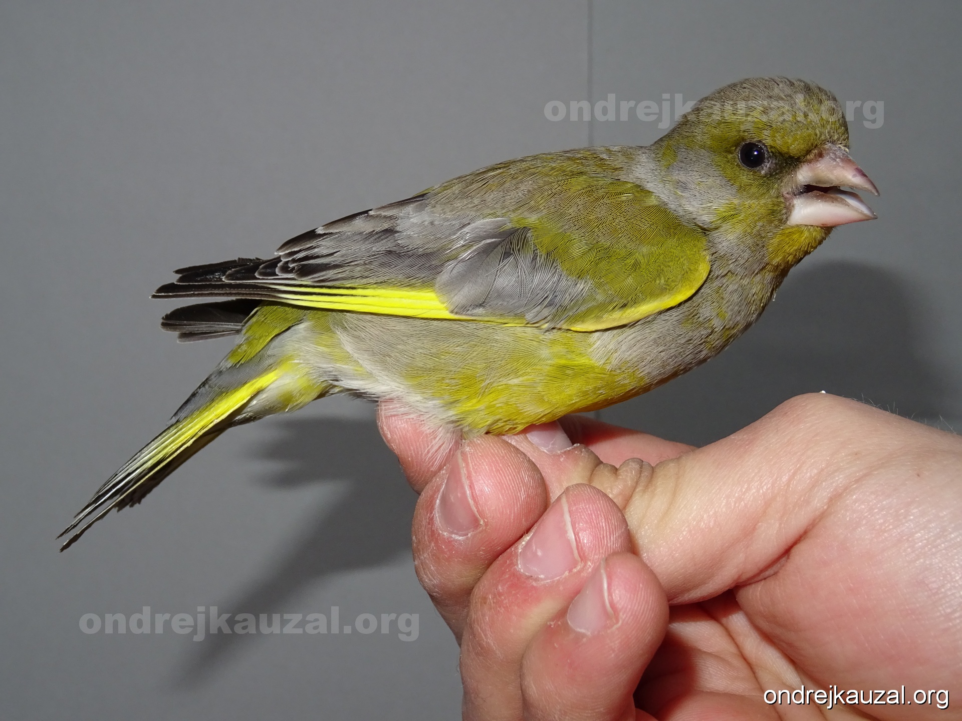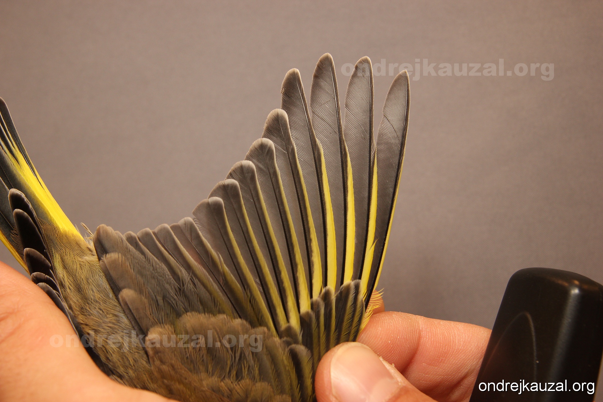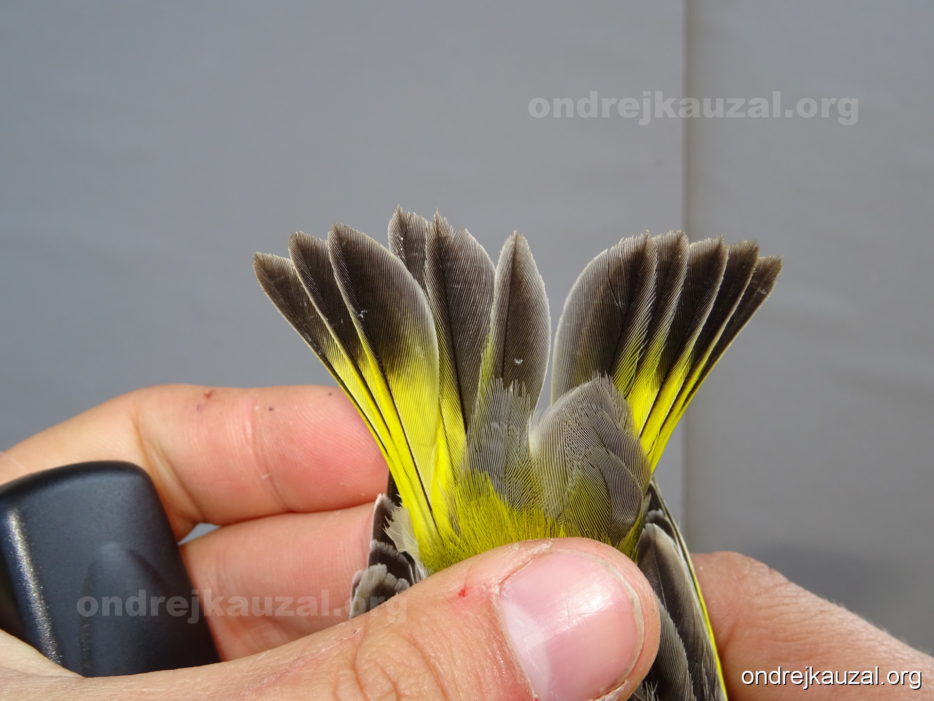 An interesting individual, albeit being in the first year of its life, it has moulted three of its primaries (P5 – P7). Greenfinches occasionally include moult of some primaries during their partial postjuvenile moult.
