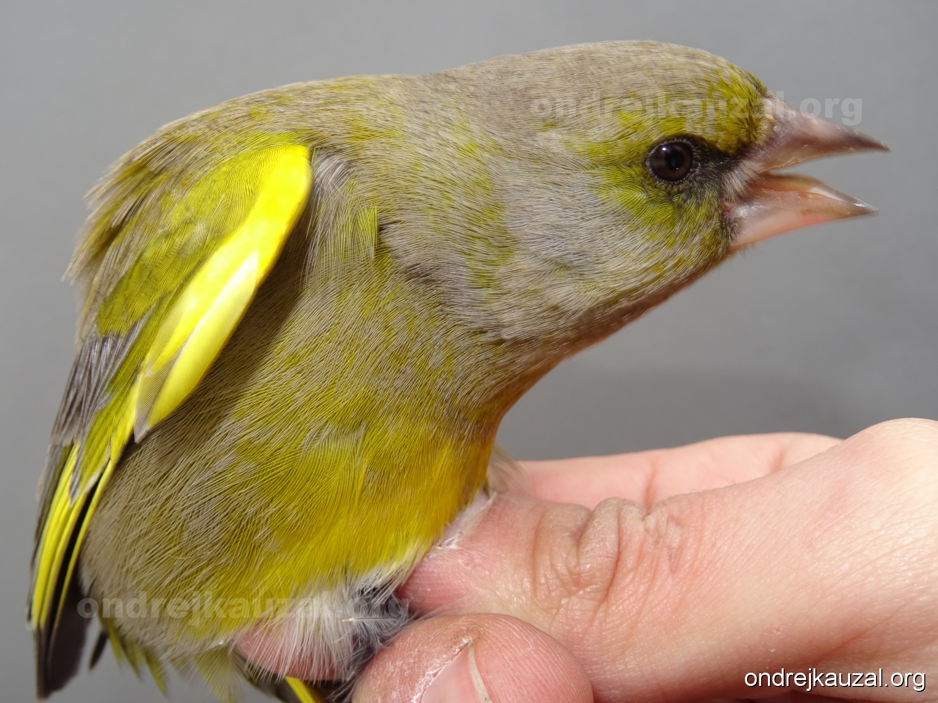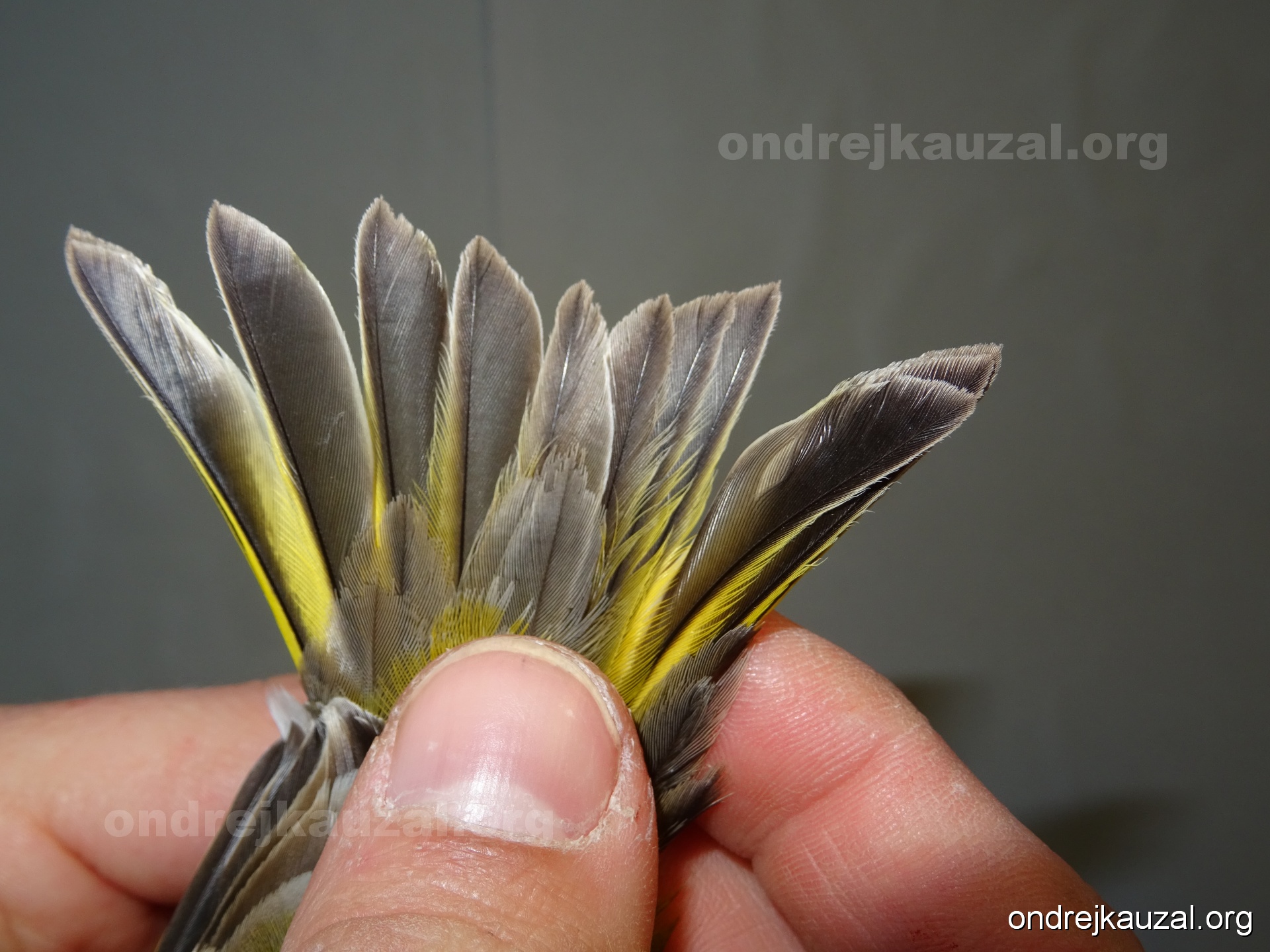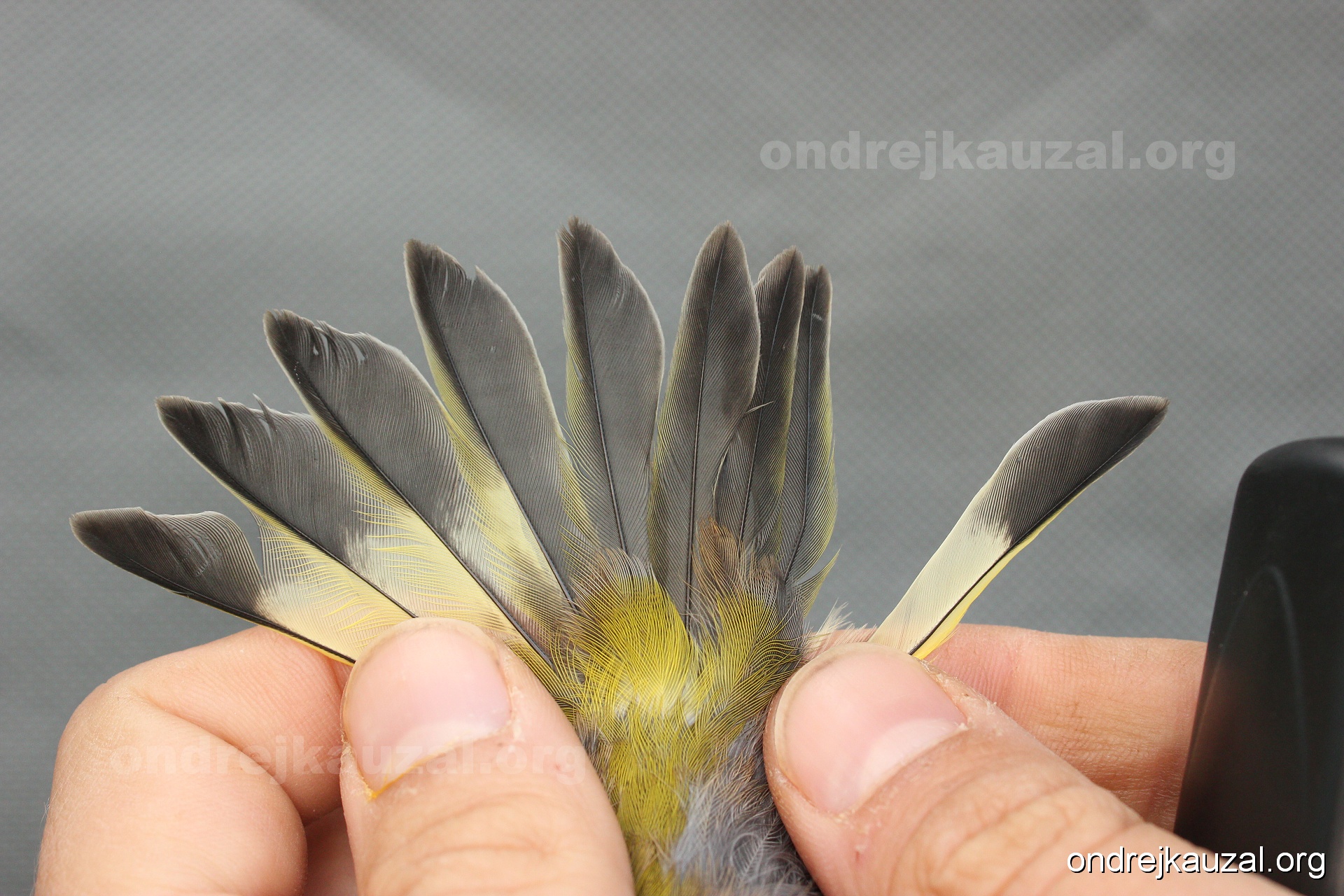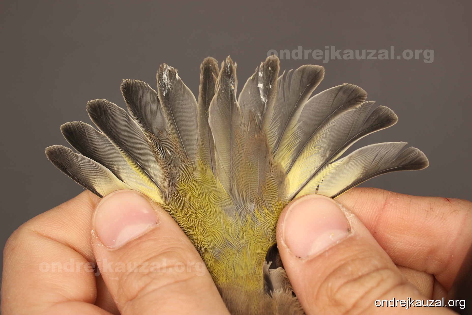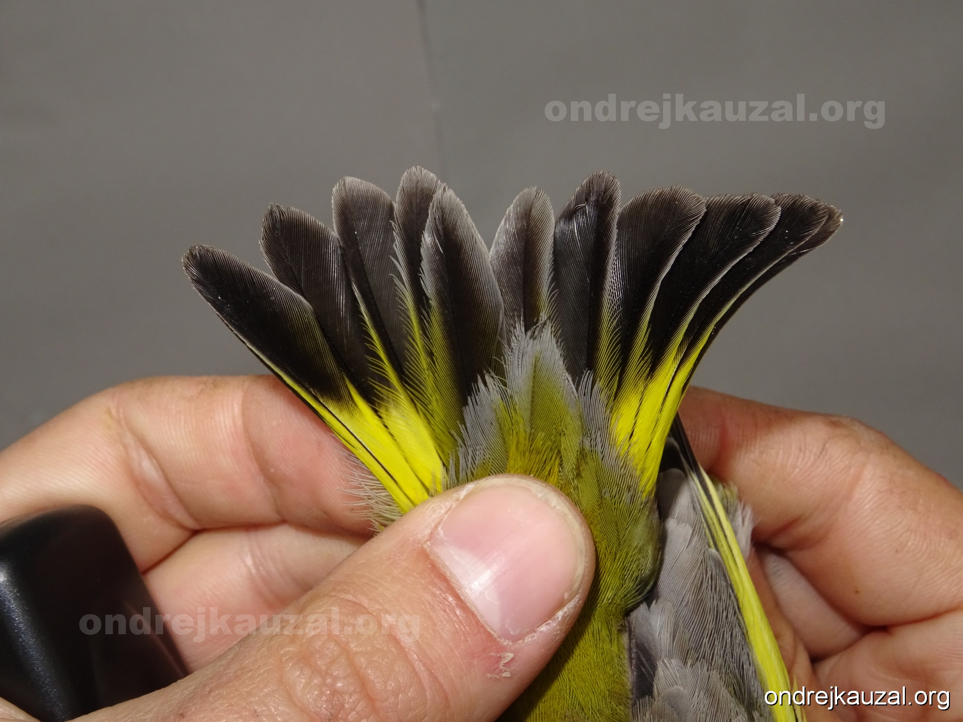 An interesting individual, albeit being in the first year of its life, it has moulted three of its primaries (P5 – P7). Greenfinches occasionally include moult of some primaries during their partial postjuvenile moult.