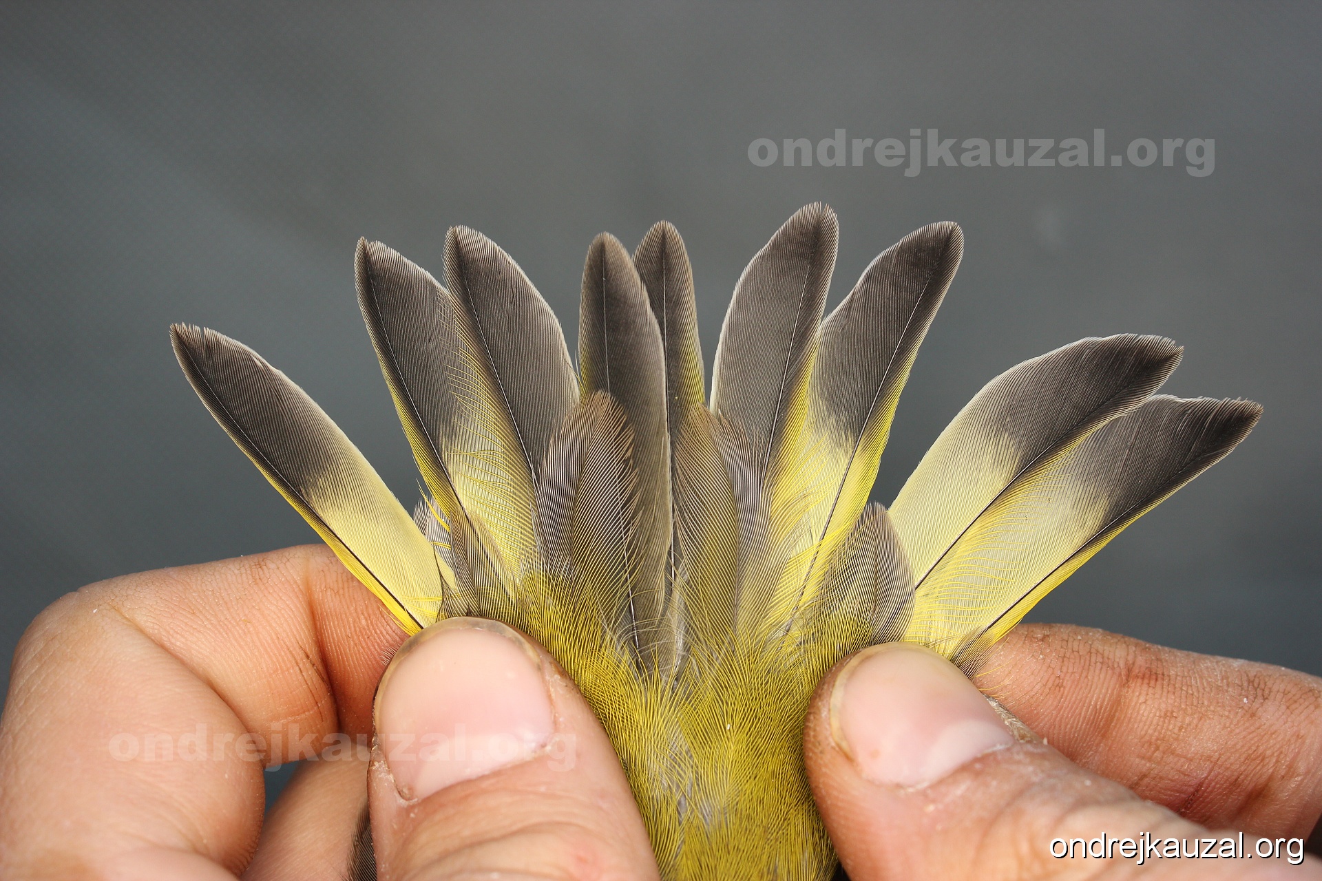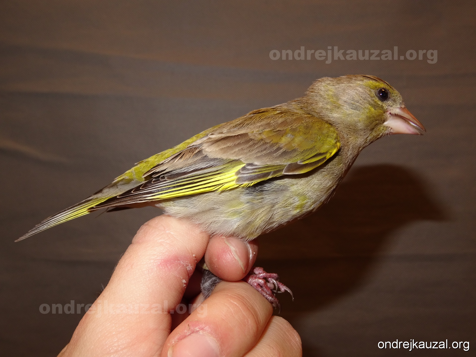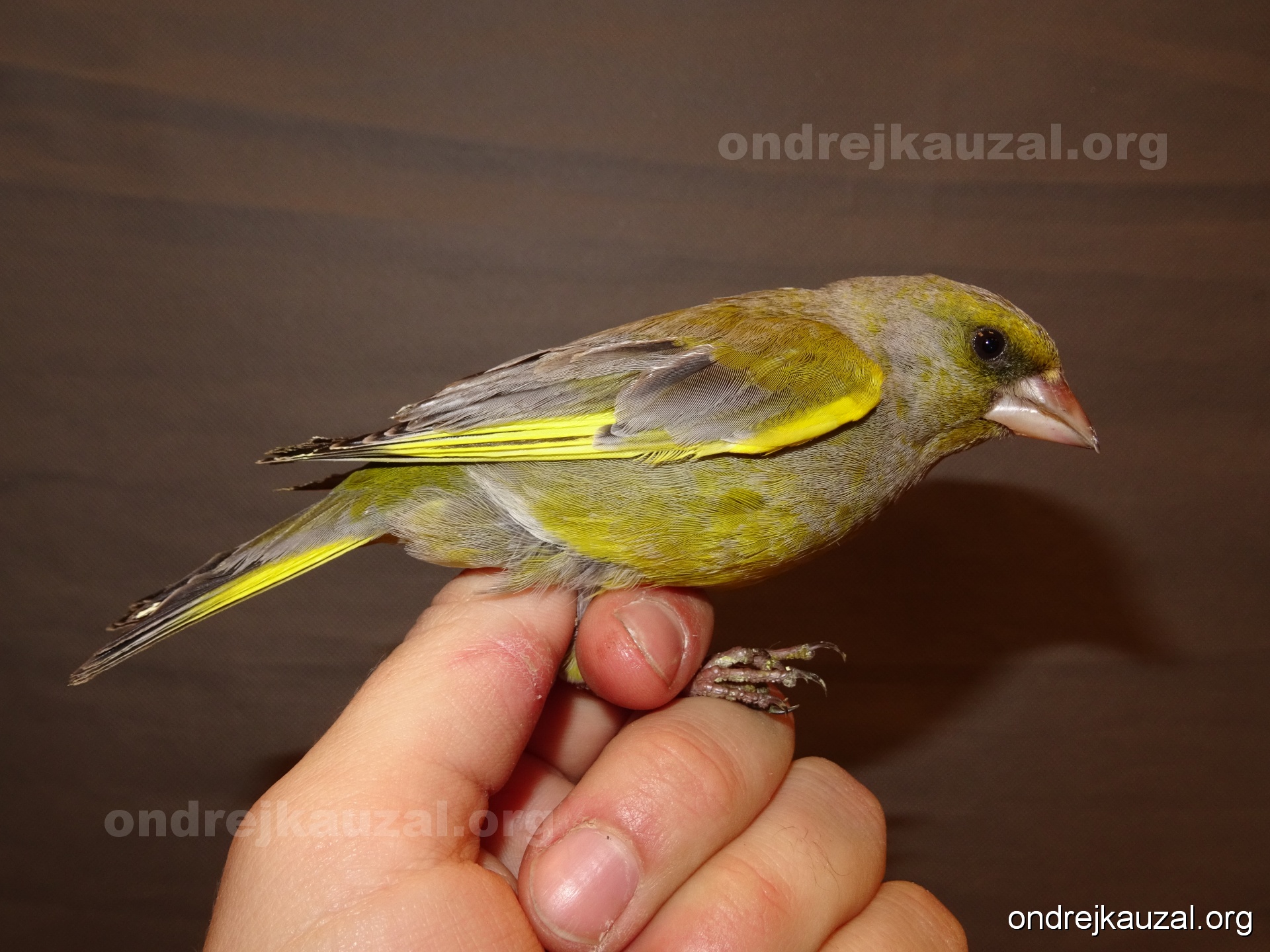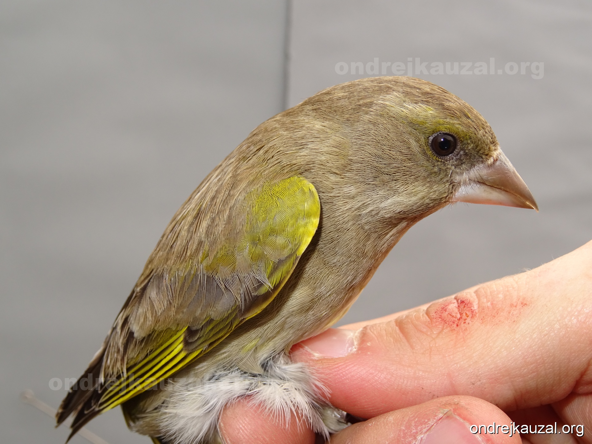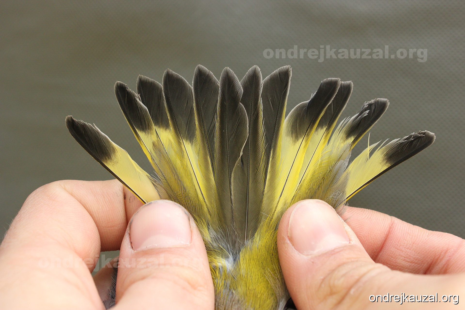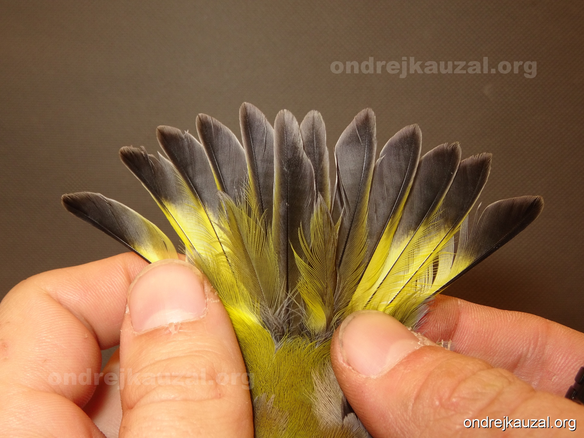 An interesting individual, albeit being in the first year of its life, it has moulted three of its primaries (P5 – P7). Greenfinches occasionally include moult of some primaries during their partial postjuvenile moult.