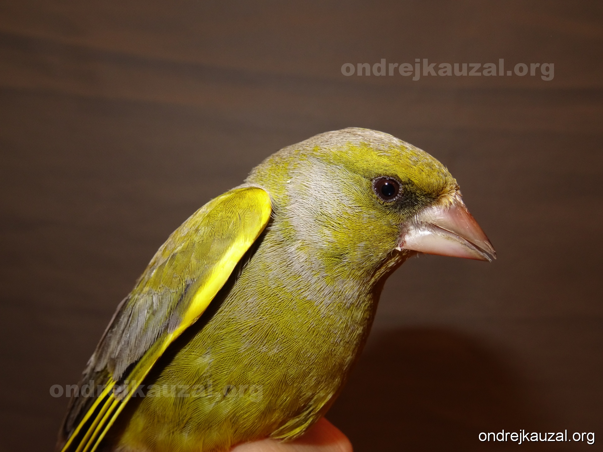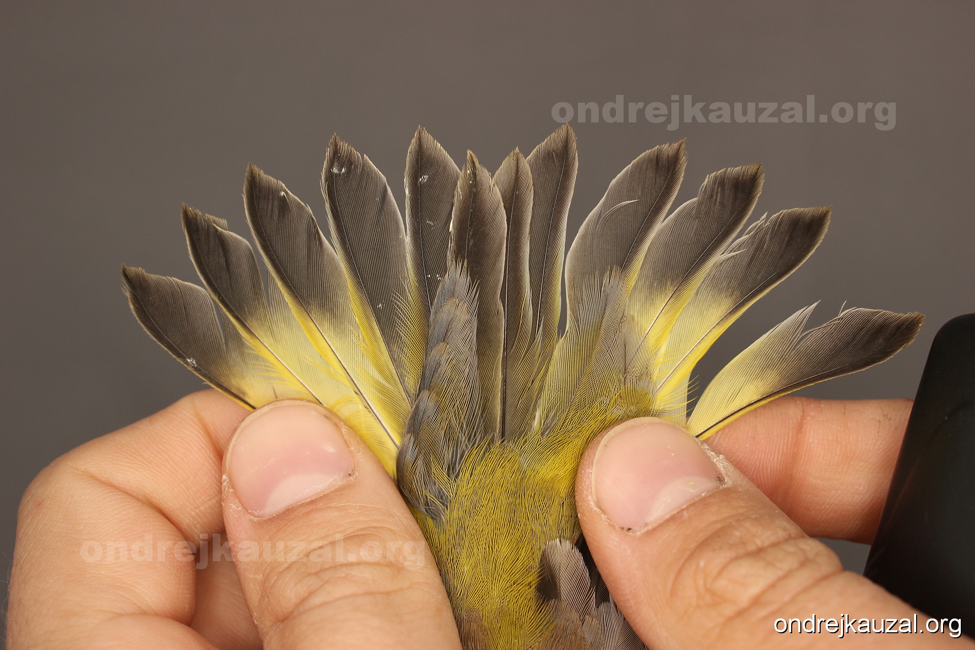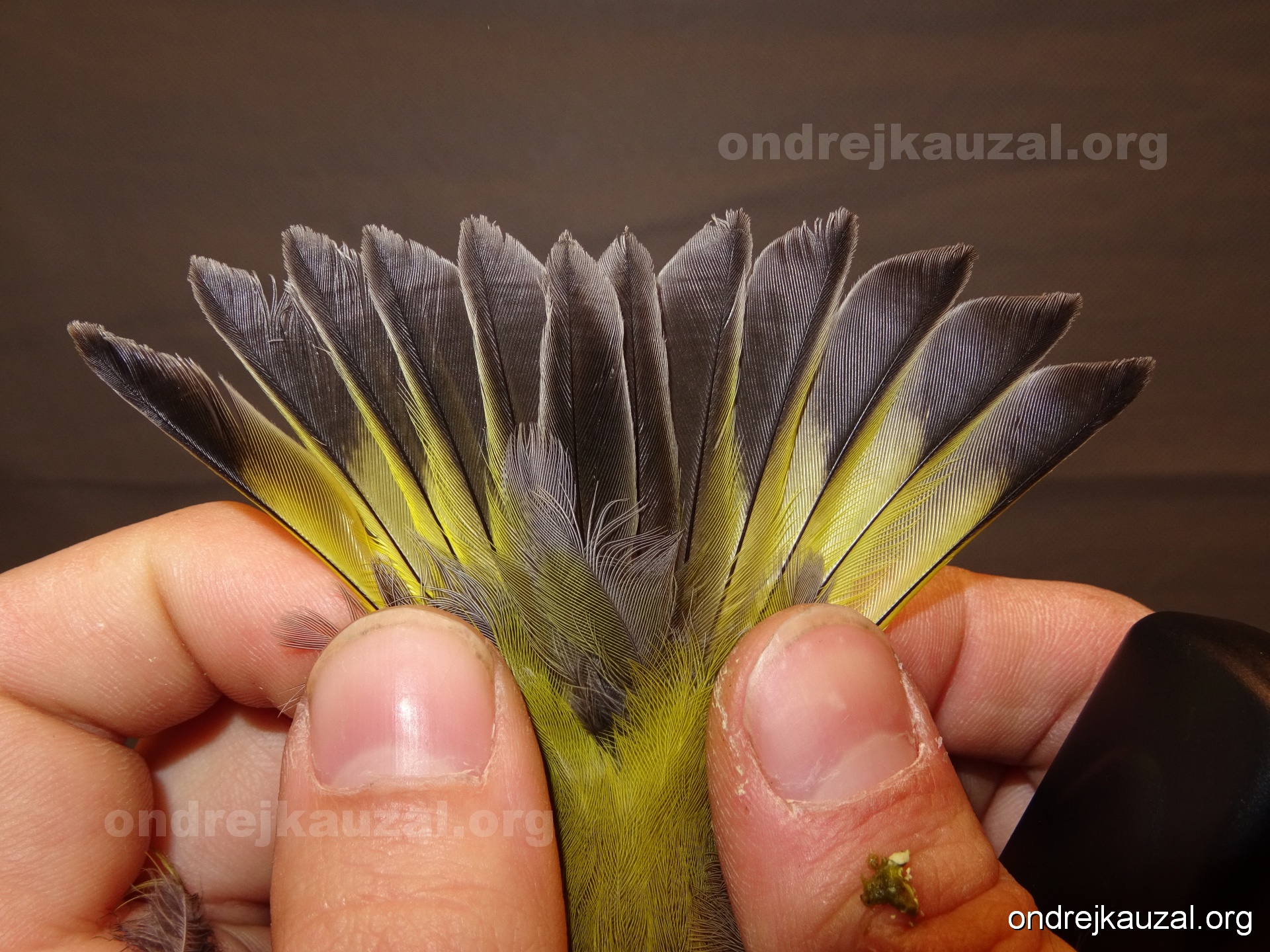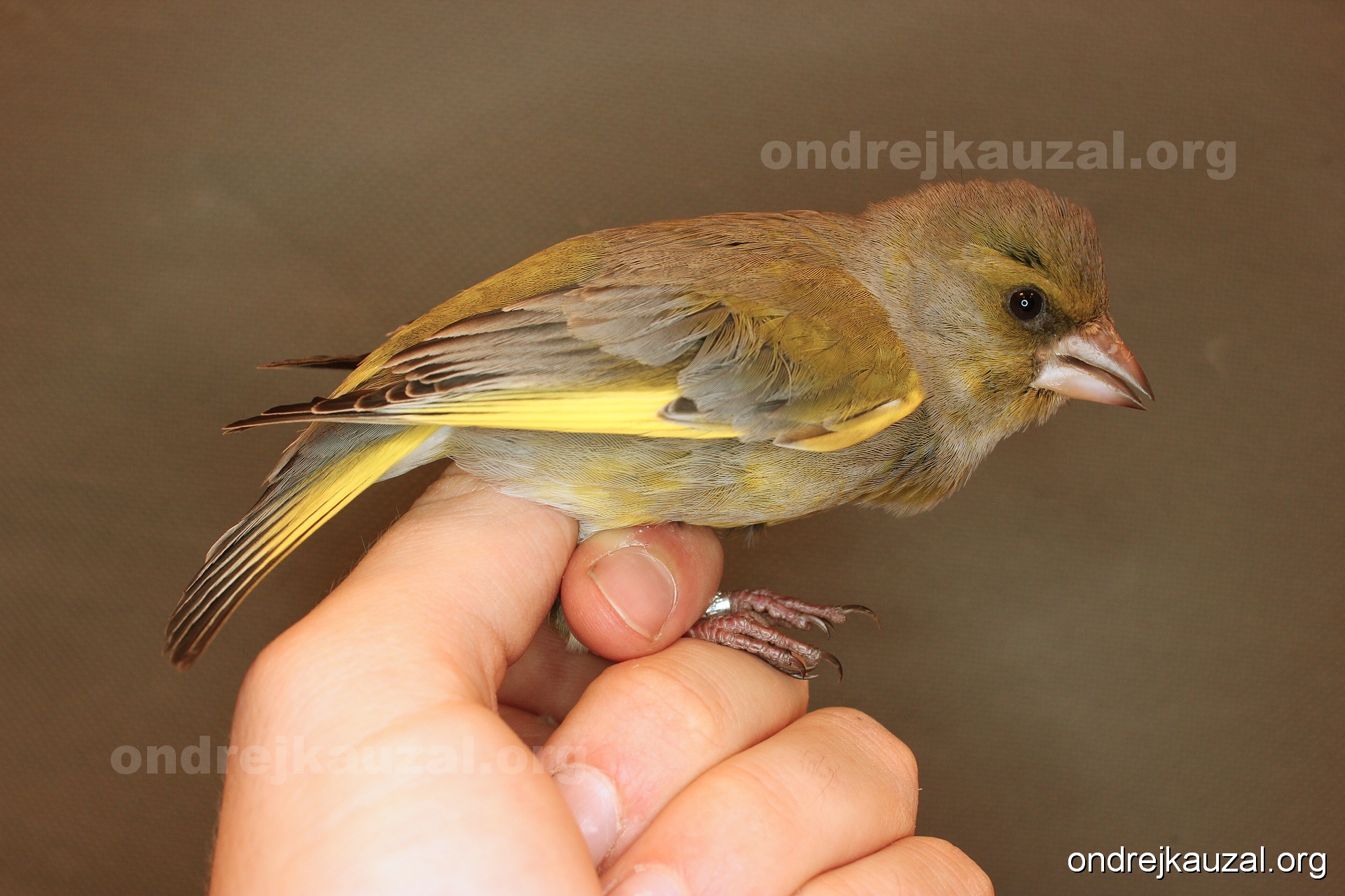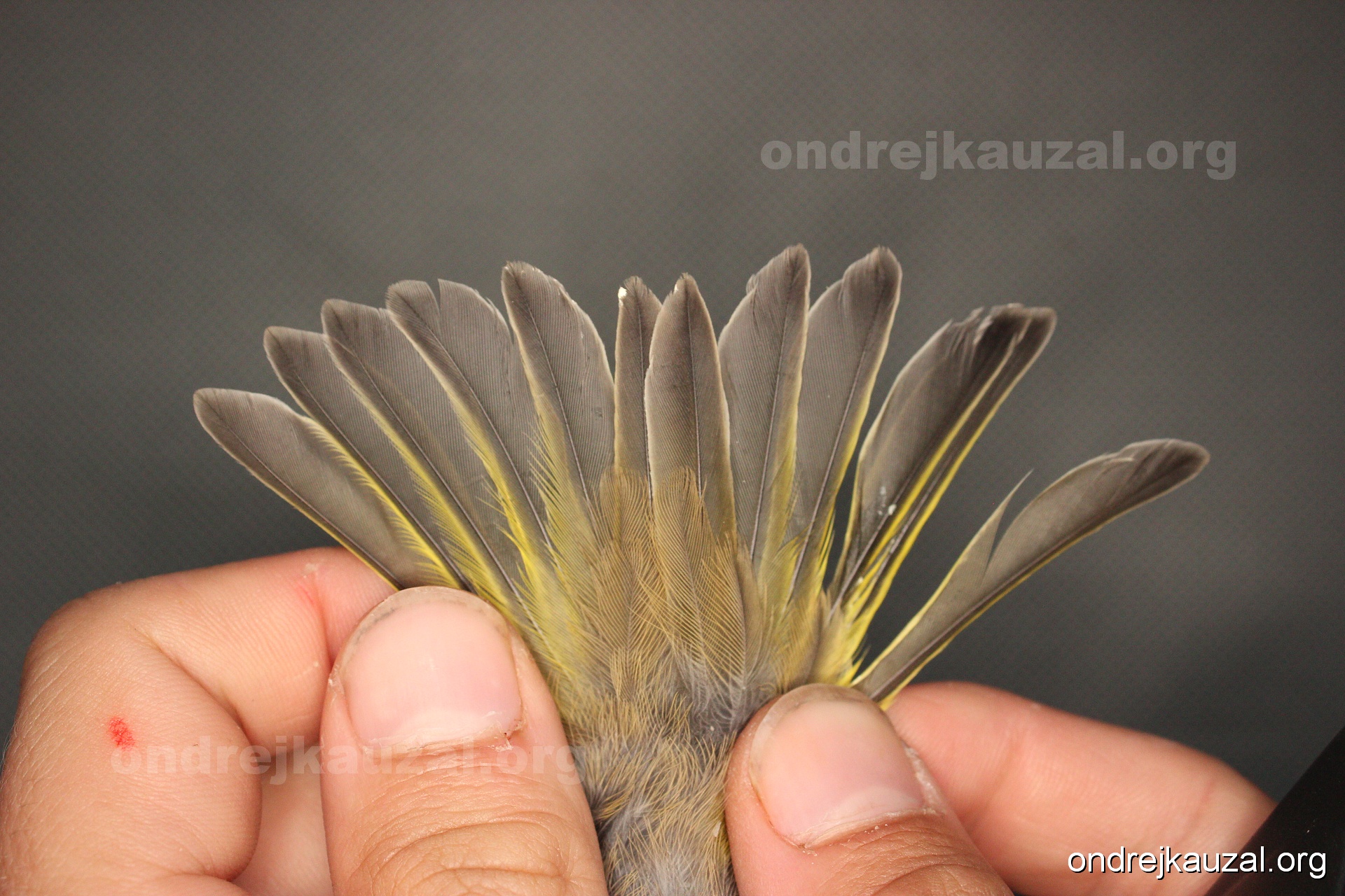 An interesting individual, albeit being in the first year of its life, it has moulted three of its primaries (P5 – P7). Greenfinches occasionally include moult of some primaries during their partial postjuvenile moult.