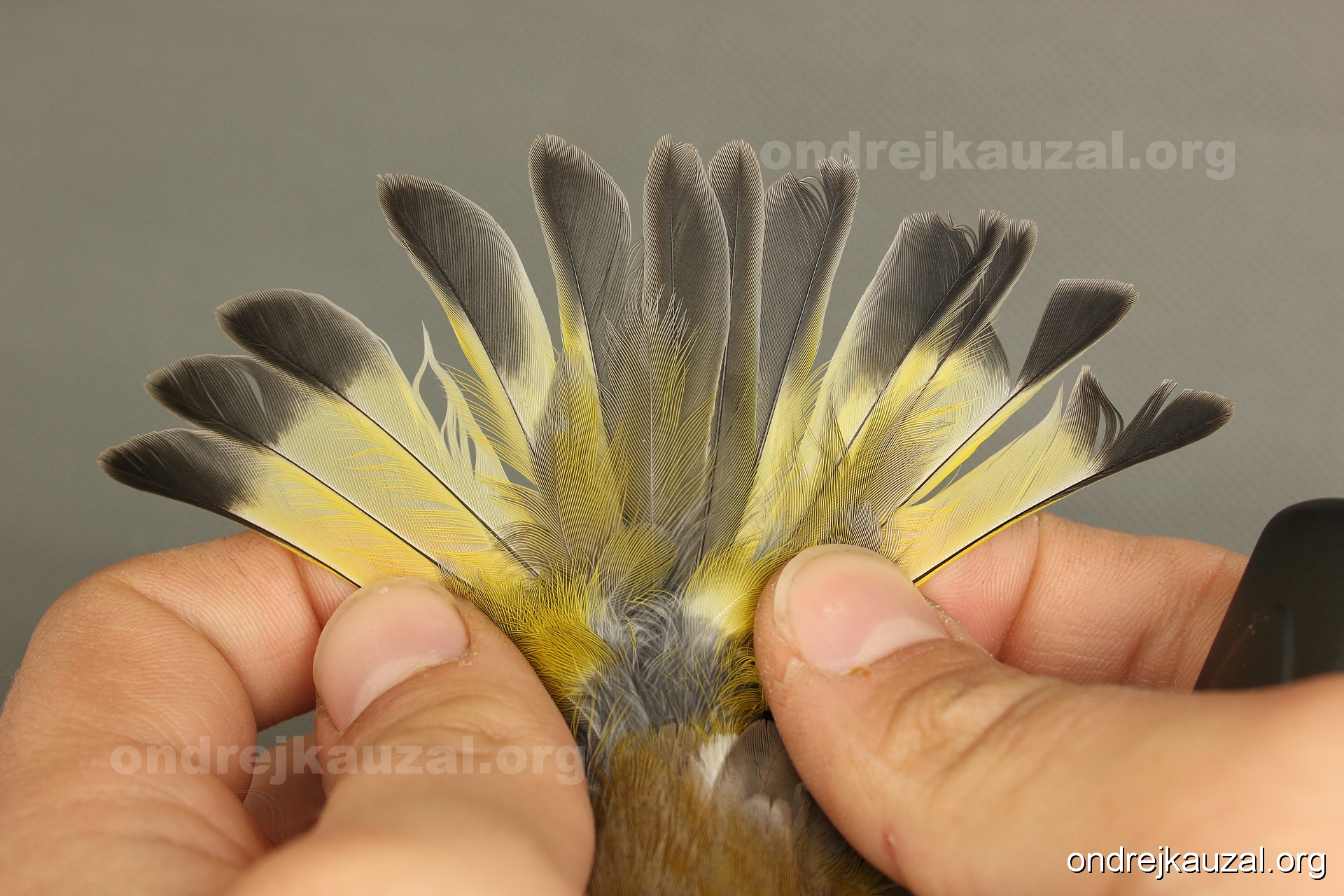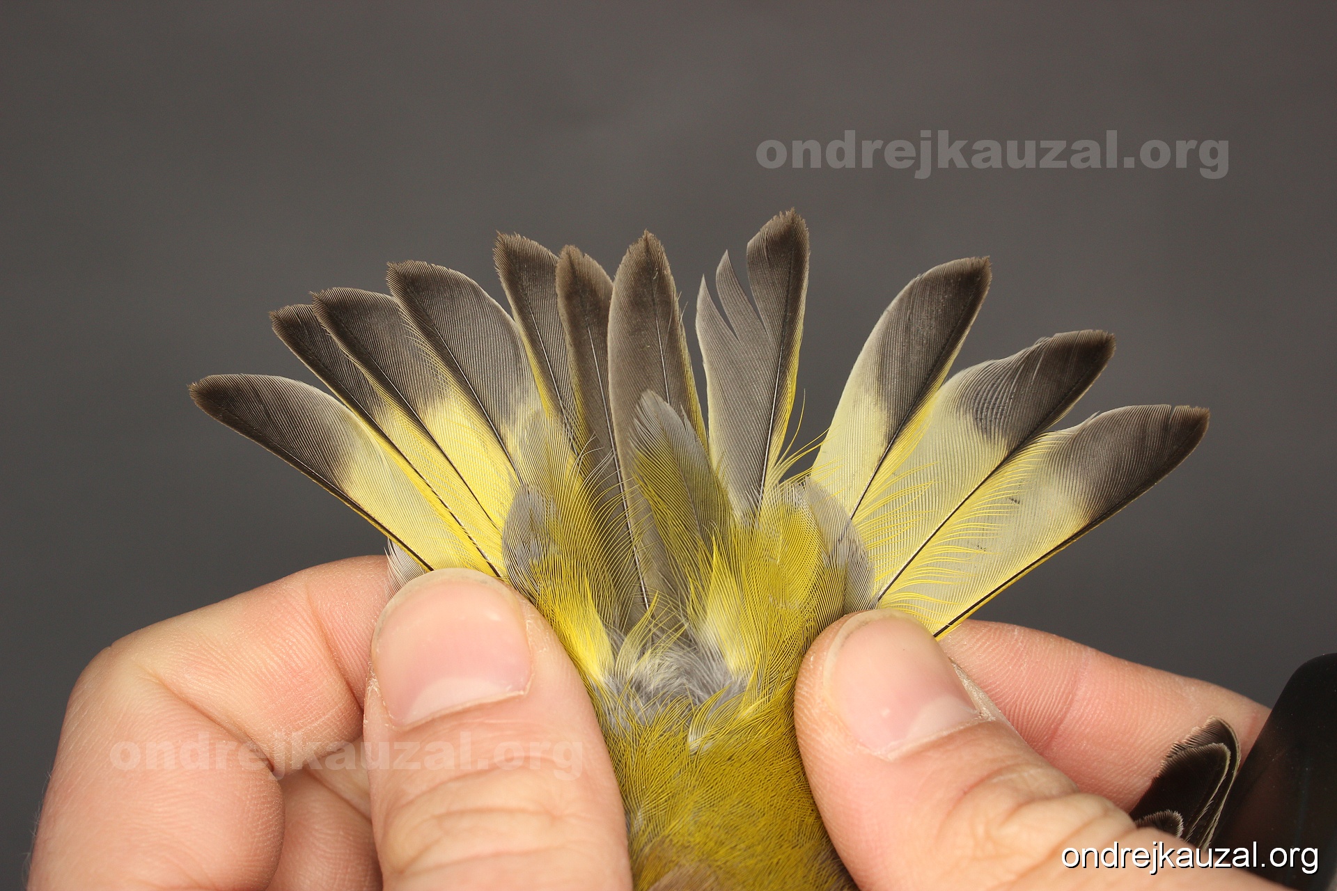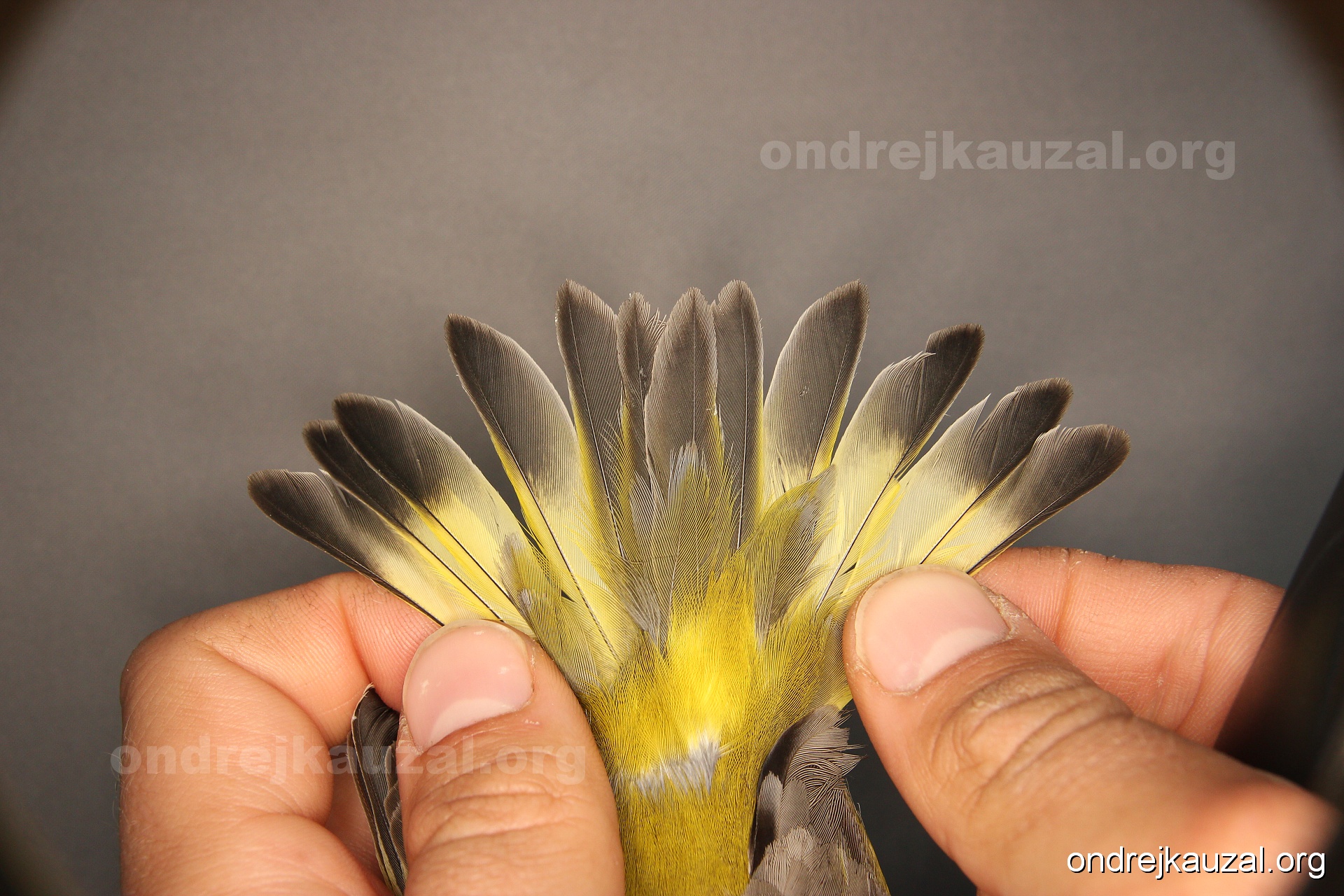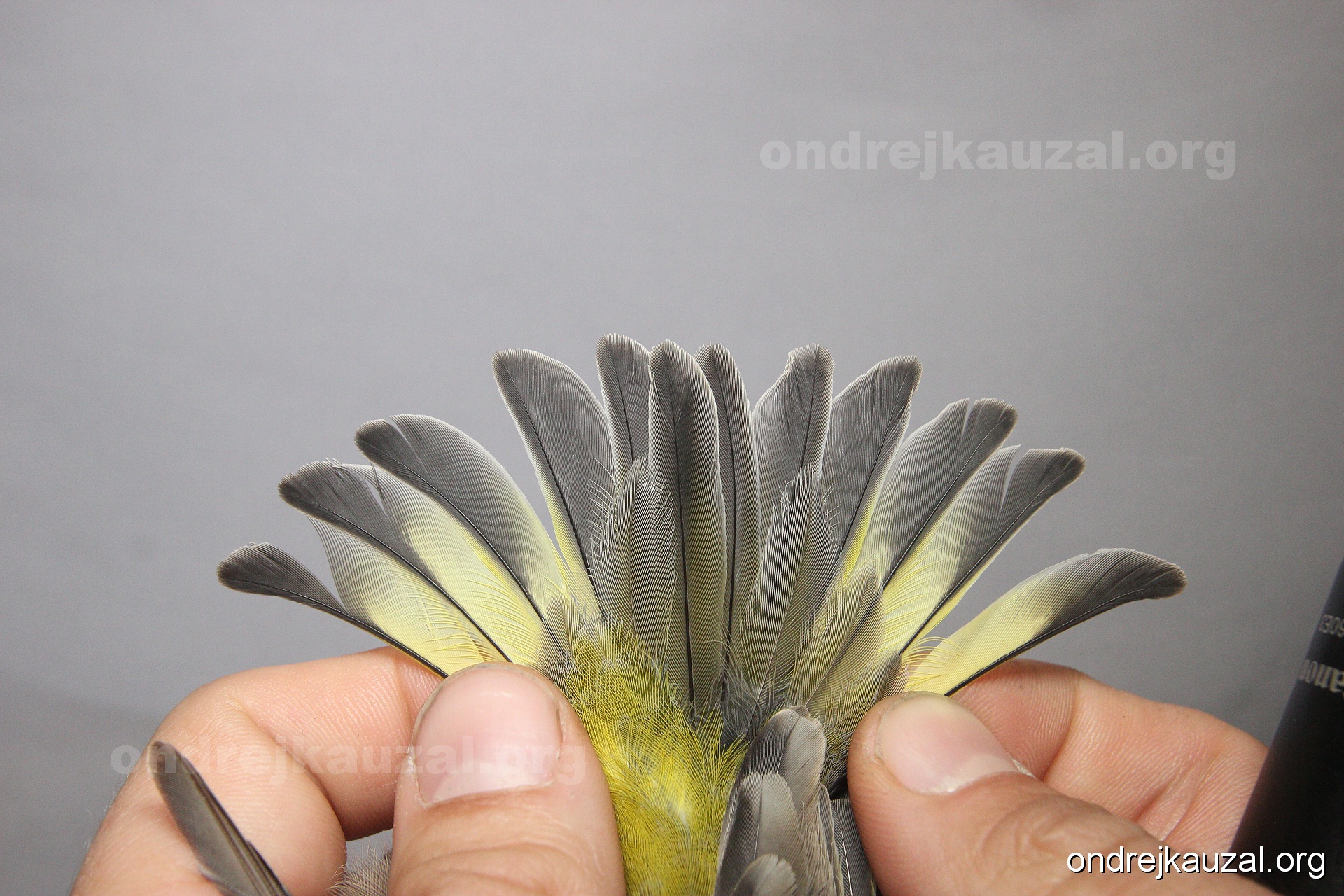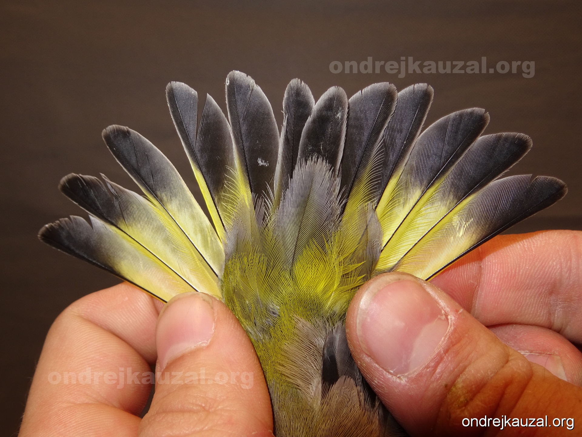 An interesting individual, albeit being in the first year of its life, it has moulted three of its primaries (P5 – P7). Greenfinches occasionally include moult of some primaries during their partial postjuvenile moult.