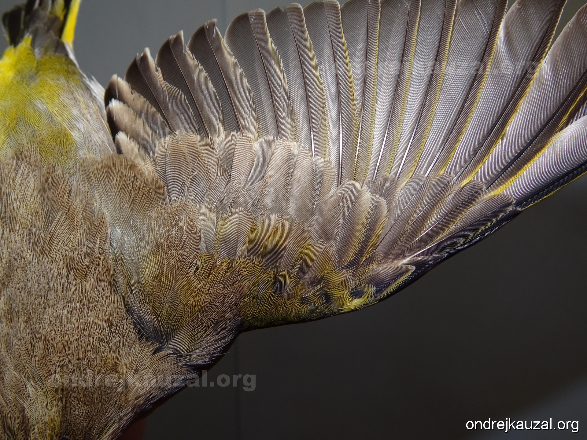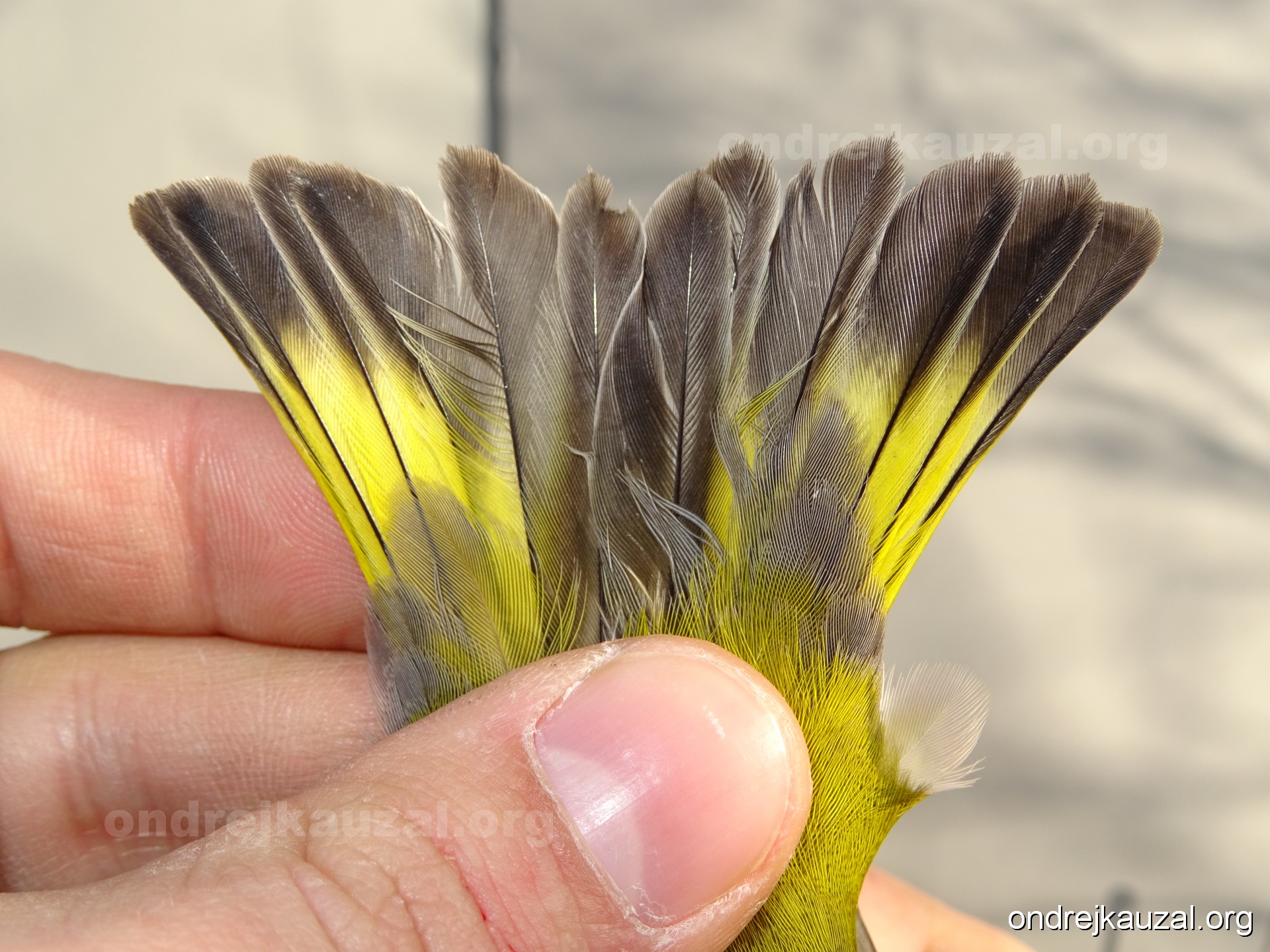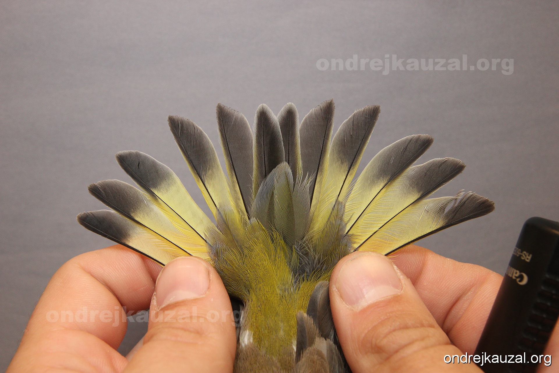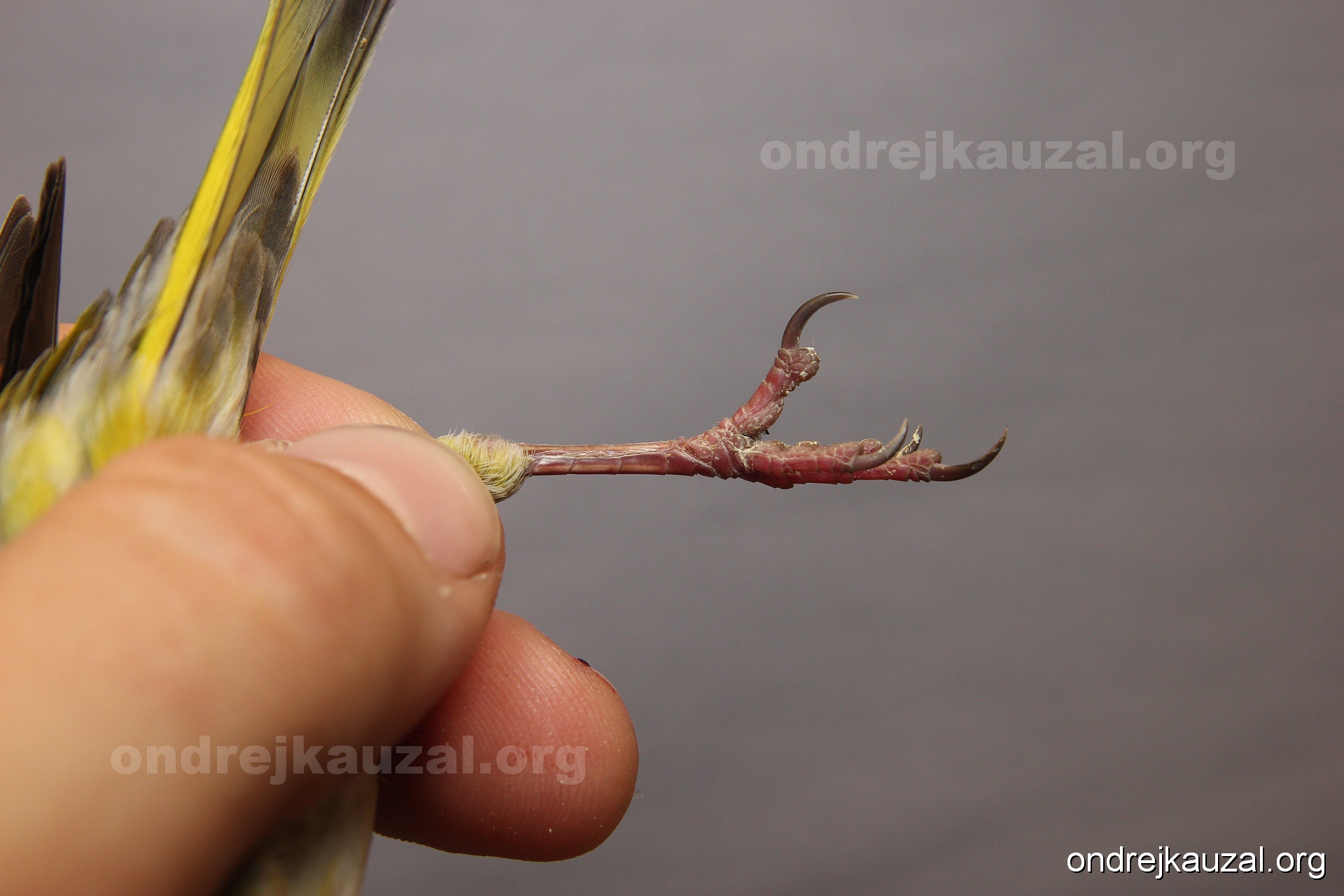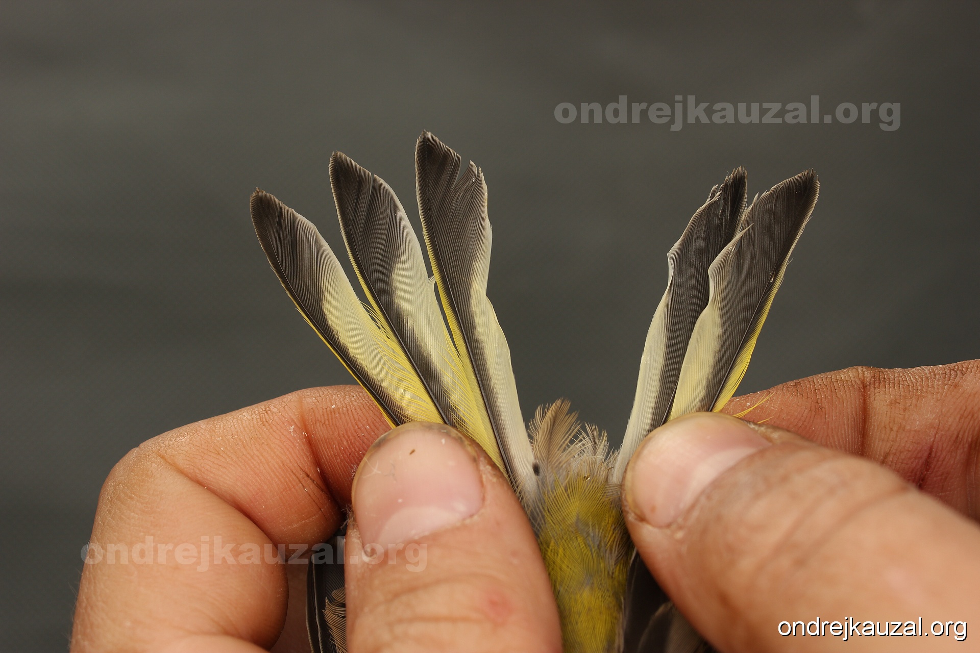 An interesting individual, albeit being in the first year of its life, it has moulted three of its primaries (P5 – P7). Greenfinches occasionally include moult of some primaries during their partial postjuvenile moult.